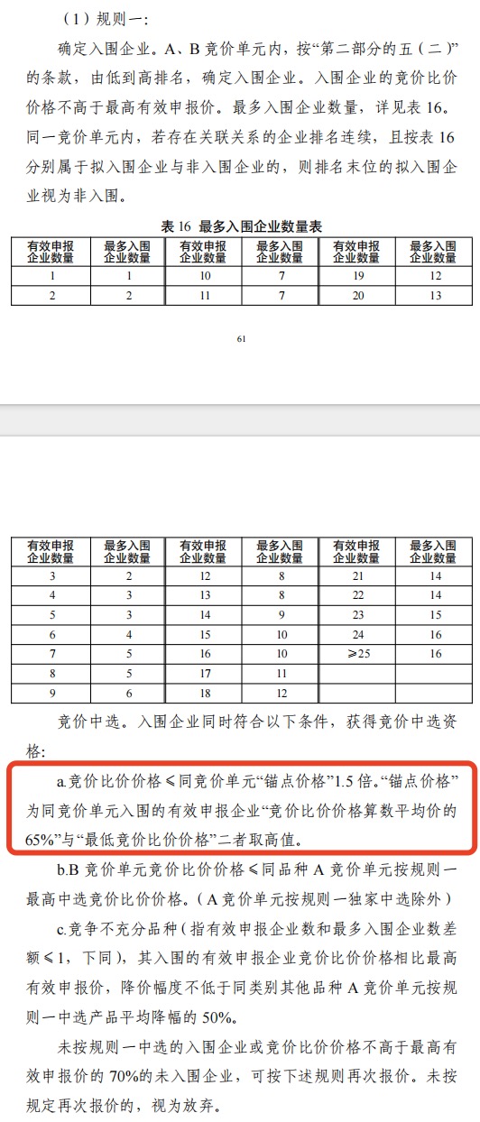 此外,多重復(fù)活機(jī)制進(jìn)一步優(yōu)化了競爭格局。未中選企業(yè)可通過規(guī)則二、規(guī)則三下調(diào)報(bào)價再次爭取中選資格,這一機(jī)制可以提升企業(yè)參與的容錯率。但需注意的是,按規(guī)則三中選的復(fù)活企業(yè),不具備剩余量分配資格。